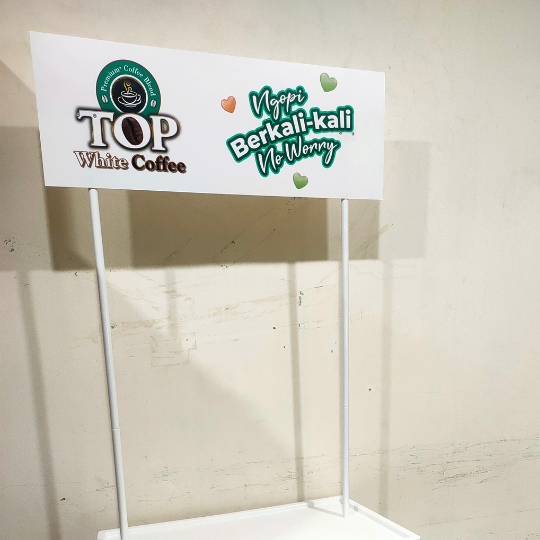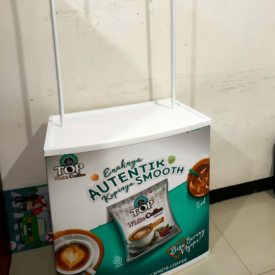 Proyek evendesk custom ini dikerjakan untuk Top White Coffee, dengan tujuan menghadirkan meja promosi yang fungsional, estetik, dan mudah dipindahkan. Dengan desain full color serta hasil cetak tajam, evendesk ini menjadi media branding yang efektif di berbagai event maupun display toko.