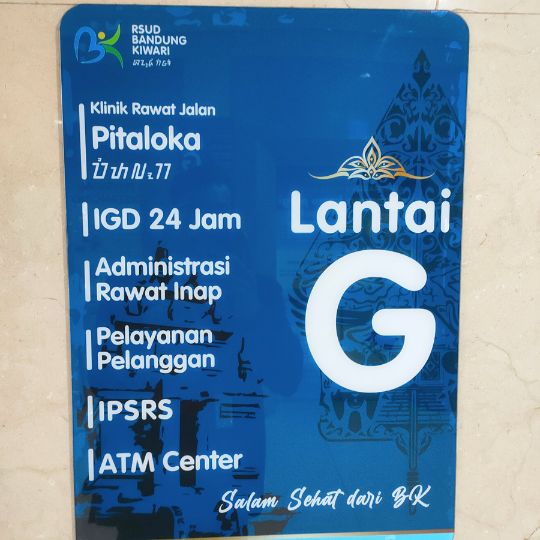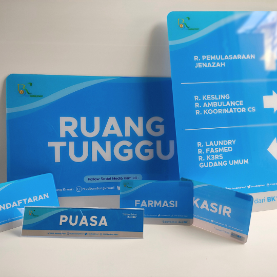 Proyek sign akrilik custom ini dikerjakan untuk RSUD Bandung Kiwari, dengan tujuan menghadirkan media identitas yang modern, rapi, dan profesional. Menggunakan bahan akrilik berkualitas dengan finishing presisi, sign ini memberikan tampilan elegan sekaligus memperkuat branding visual instansi.