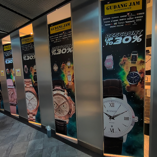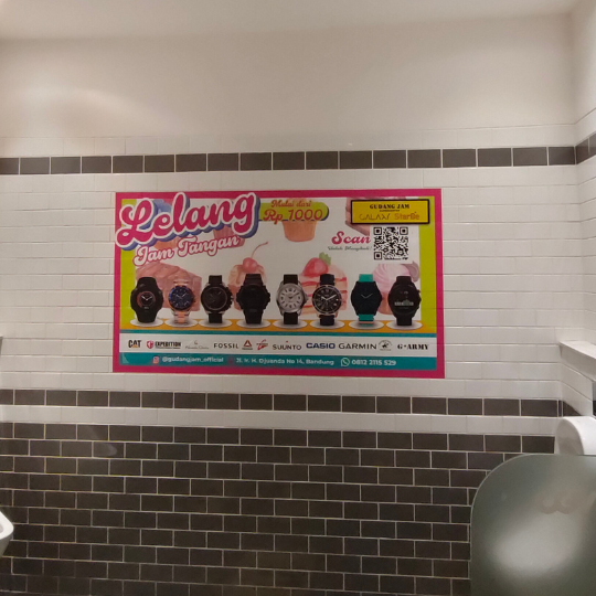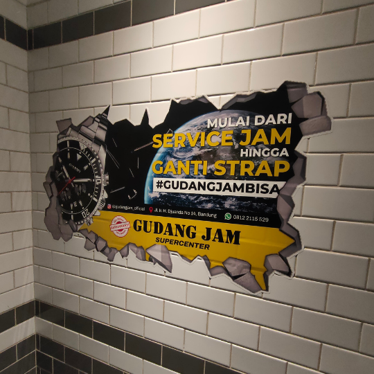 Proyek wall branding custom ini dikerjakan untuk Gudang Jam, dengan tujuan memperkuat identitas brand sekaligus memberikan tampilan ruangan yang lebih modern, estetik, dan nyaman dipandang. Desain dicetak full color menggunakan mesin berteknologi tinggi sehingga menghasilkan warna tajam, detail presisi, dan sesuai karakter brand.