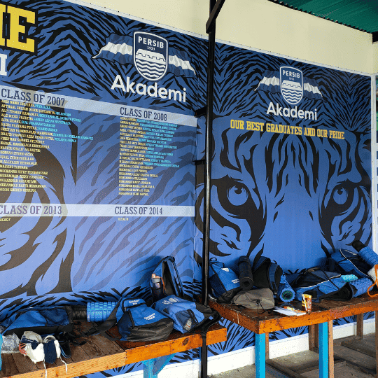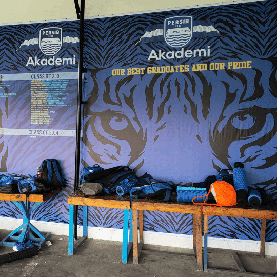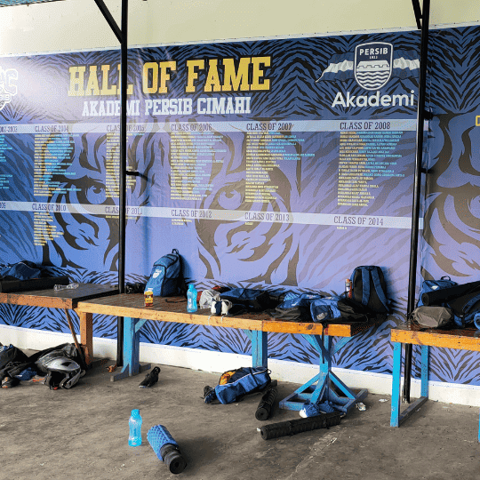 Proyek wall branding custom ini dikerjakan untuk Akademi Persib Cimahi, dengan tujuan menghadirkan identitas visual yang kuat sekaligus membuat ruangan lebih estetik dan penuh semangat olahraga. Desain dicetak full color menggunakan mesin berteknologi tinggi, menghasilkan warna tajam, detail presisi, dan sesuai karakter brand Persib.