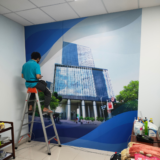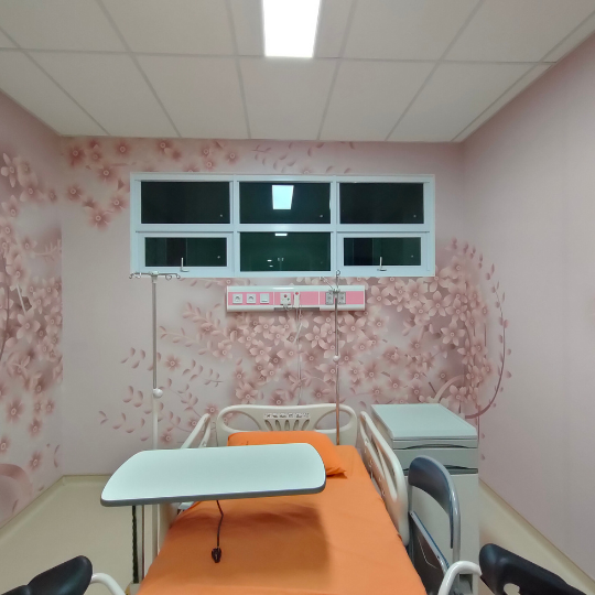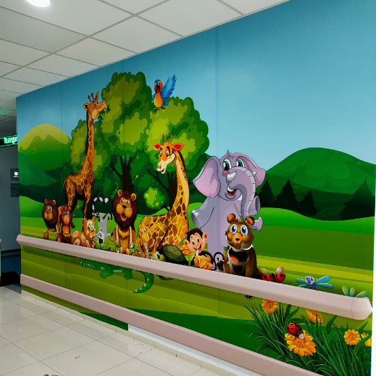 Proyek wallpaper custom ini dikerjakan untuk RSUD Bandung Kiwari, dengan tujuan menghadirkan tampilan ruangan yang lebih estetik dan nyaman. Desain dicetak full color menggunakan mesin berteknologi tinggi, menghasilkan warna yang tajam dan detail sesuai permintaan klien.